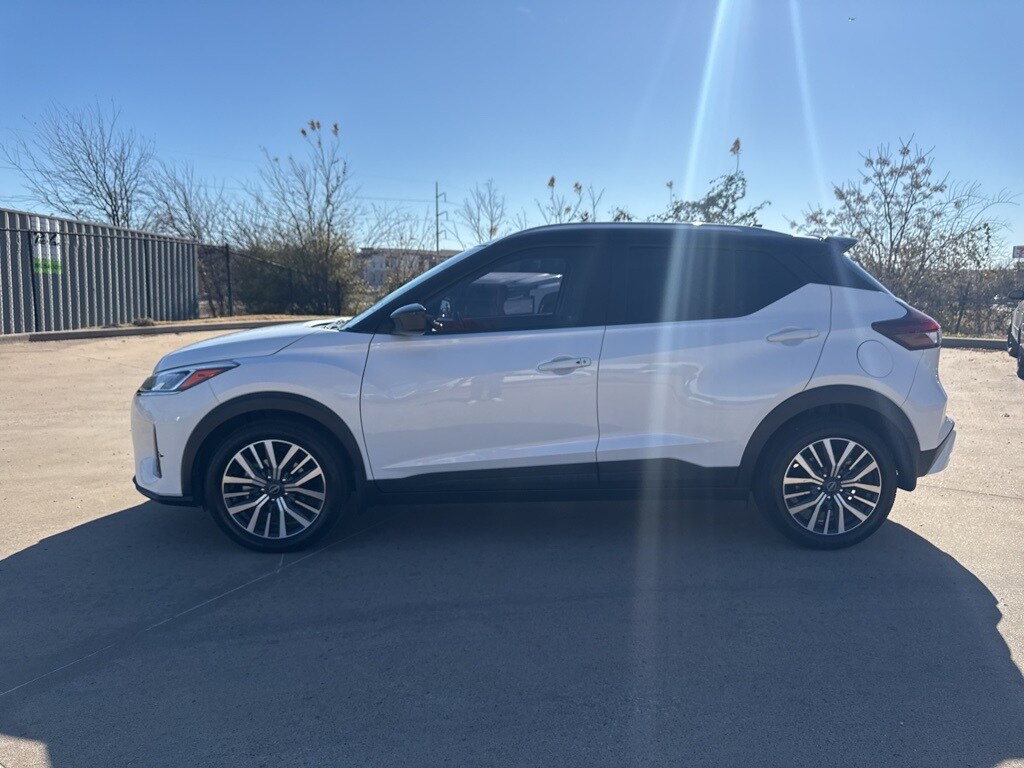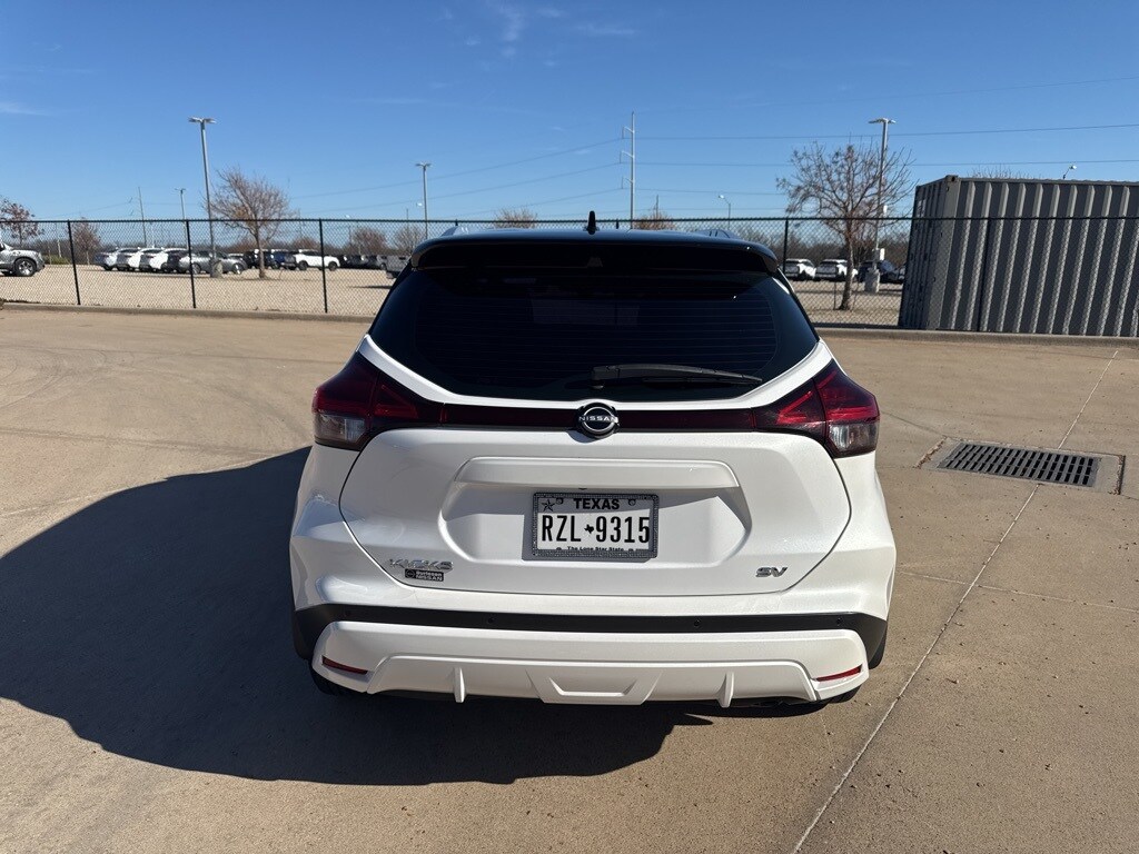 New Price! CARFAX One-Owner. Clean CARFAX. Certified. Aspen White Tricoat/Super Black 2023 Nissan Kicks SV FWD CVT with Xtronic 1.6L 4-Cylinder DOHC 16V Odometer is 13389 miles below market average! 31/36 City/Highway MPG Recent Arrival!