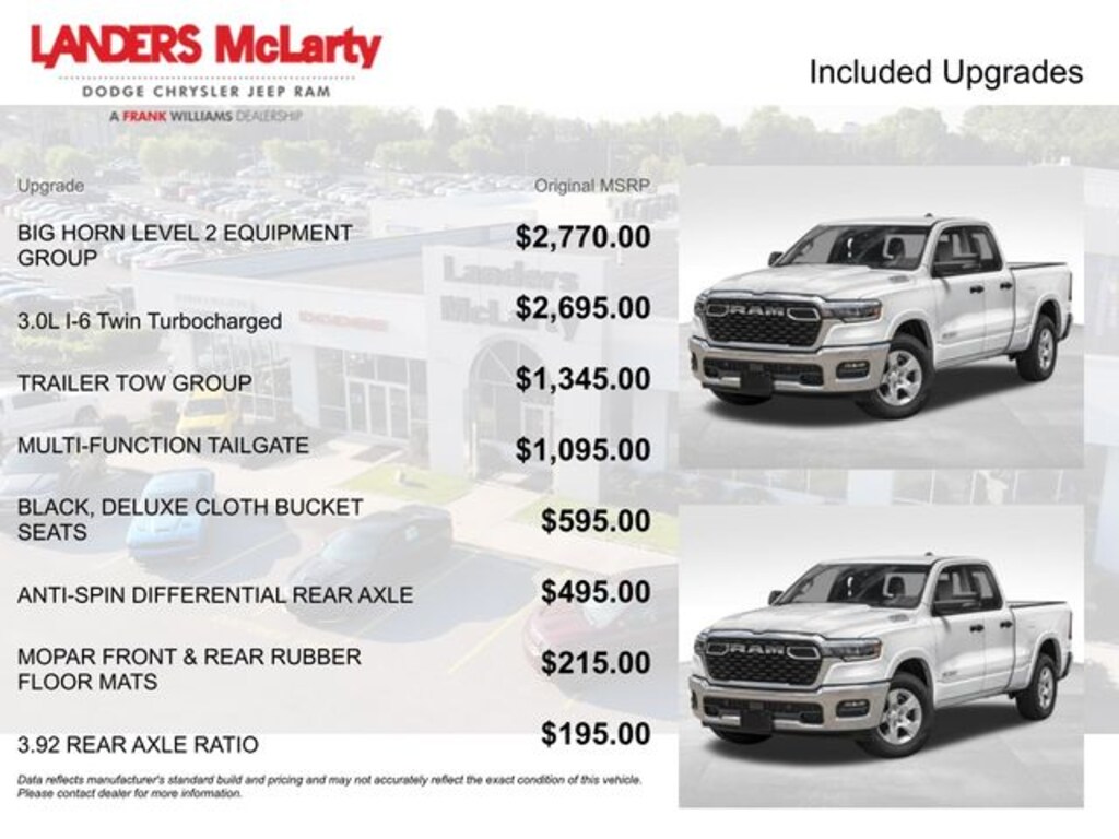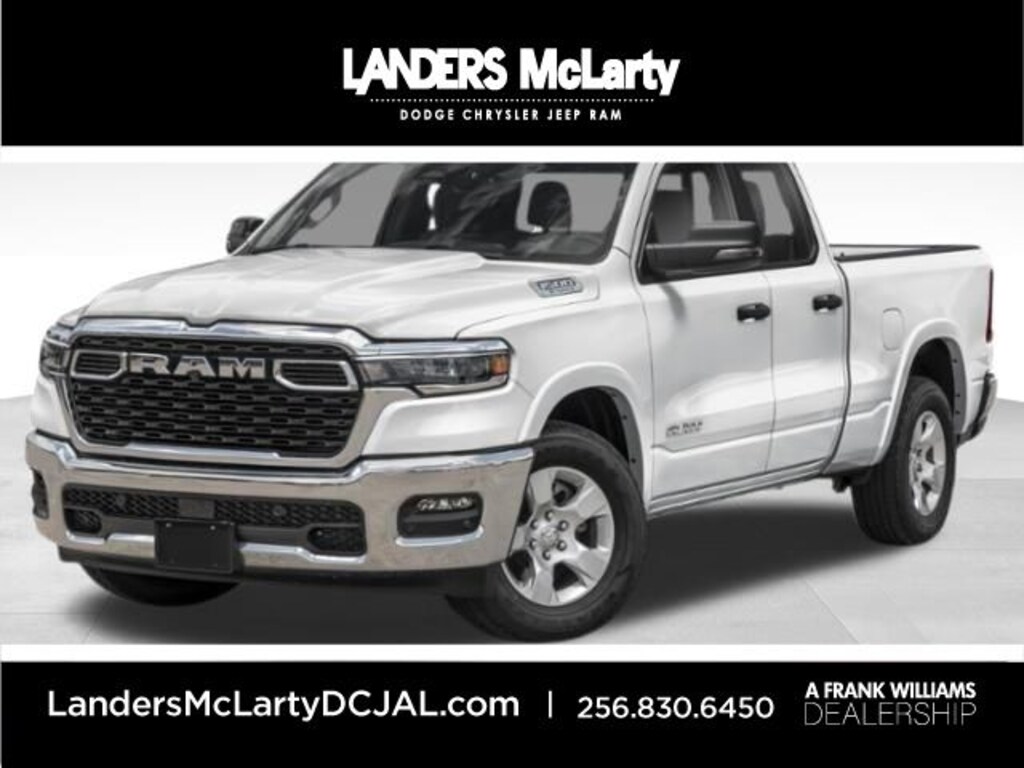 1500 Big Horn/Lone Star, 4D Quad Cab, 3.0L I6, 8-Speed Automatic, 4WD, Bright White Clearcoat, Black Cloth, 115V Auxiliary Power Outlet, 12" Touchscreen Display, 26 Gallon Fuel Tank, 3 Rear Seat Head Restraints, 4 Way Front Headrests, 4-Wheel Disc Brakes, 400W Inverter, 4G LTE Wi-Fi Hot Spot, 6 Speakers, 9 Amplified Speakers w/Subwoofer, ABS brakes, Accent Color Tailgate Handle, Air Conditioning, Air Conditioning ATC w/Dual Zone Control, Alloy wheels, AM/FM radio, Anti-Spin Differential Rear Axle, Apple CarPlay, Apple CarPlay/Android Auto, Auto High-beam Headlights, Auto Power-Folding Mirrors, Auto-Dimming Exterior Driver Mirror, Auto-Dimming Rear-View Mirror, Big Horn Level 2 Equipment Group, Black Exterior Mirrors, Black Premium Power Mirrors, Black Trailer Tow Power Mirrors, Brake assist, Bumpers: chrome, Chrome RAM Grille Badge, Cloth Bench Seat, Cluster 7" TFT Color Display, Compass, Configurable Drive Mode, Connected Travel & Traffic Services, Connectivity - US/Canada, Convex Wide-Angle Exterior Mirror Insert, Delay-off headlights, Driver door bin, Dual front impact airbags, Dual front side impact airbags, Electronic Stability Control, Exterior Mirrors Courtesy Lamps, Exterior Mirrors w/Heating Element, Exterior Mirrors w/Supplemental Signals, Front anti-roll bar, Front Center Armrest w/Storage, Front fog lights, Front reading lights, Front Seat Back Map Pockets, Front wheel independent suspension, Fully automatic headlights, Glove Box Lamp, Google Android Auto, GPS Antenna Input, GPS Navigation, HD Radio, Heated door mirrors, Heated Front Seats, Heated Steering Wheel, Illuminated entry, Integrated Voice Command w/Bluetooth, Leather Wrapped Steering Wheel, LED Dome Lamp w/On/Off Switch, LED Footwell Lighting, Low tire pressure warning, Manual Adjust 4-Way Front Passenger Seat, Manual Folding Exterior Mirrors, Manual Telescoping Mirrors, Mirror Clearance/Running Lights, MOPAR Front & Rear Rubber Floor Mats, Multi-Function Tailgate, Occupant sensing airbag, Outside temperature display, Overhead airbag, Overhead console, Overhead LED Lamps, Panic alarm, ParkView Rear Back-Up Camera, Passenger door bin, Passenger vanity mirror, Power 2-Way Driver Lumbar Adjust, Power Adjust 8-Way Driver Seat, Power Adjustable Pedals, Power door mirrors, Power steering, Power windows, Power-Adjustable Convex Auxiliary Mirrors, Premium Overhead Console, Quick Order Package 21Z Big Horn, Radio data system, Radio: Uconnect 5 Nav w/12" Display, Radio: Uconnect 5 w/8.4" Display, RAM's Head Badge, Rear 60/40 Folding Seat, Rear anti-roll bar, Rear Power Sliding Window, Rear seat center armrest, Rear step bumper, Rear Window Defroster, Remote keyless entry, Remote Tailgate Release, Security Alarm, SiriusXM w/360L, Speed control, Split folding rear seat, Steering Wheel Mounted Audio Controls, Sun Visors w/Illuminated Vanity Mirrors, Supplier Part Tracking (J-1), Tachometer, Telescoping steering wheel, Tilt steering wheel, Traction control, Trailer Brake Control, Trailer Light Check, Trailer Reverse Steering Control, Trailer Tire Pressure Monitoring System, Trailer Tow Group, Trailer Tow Mirrors, Trip computer, Universal Garage Door Opener, USB Host Flip, Variably intermittent wipers, Voltmeter, Wheels: 18" x 8" Cast-Aluminum Painted. Clean CARFAX. Bright White Clearcoat 2025 Ram 1500 Big Horn/Lone Star 4WD 8-Speed Automatic 3.0L I6