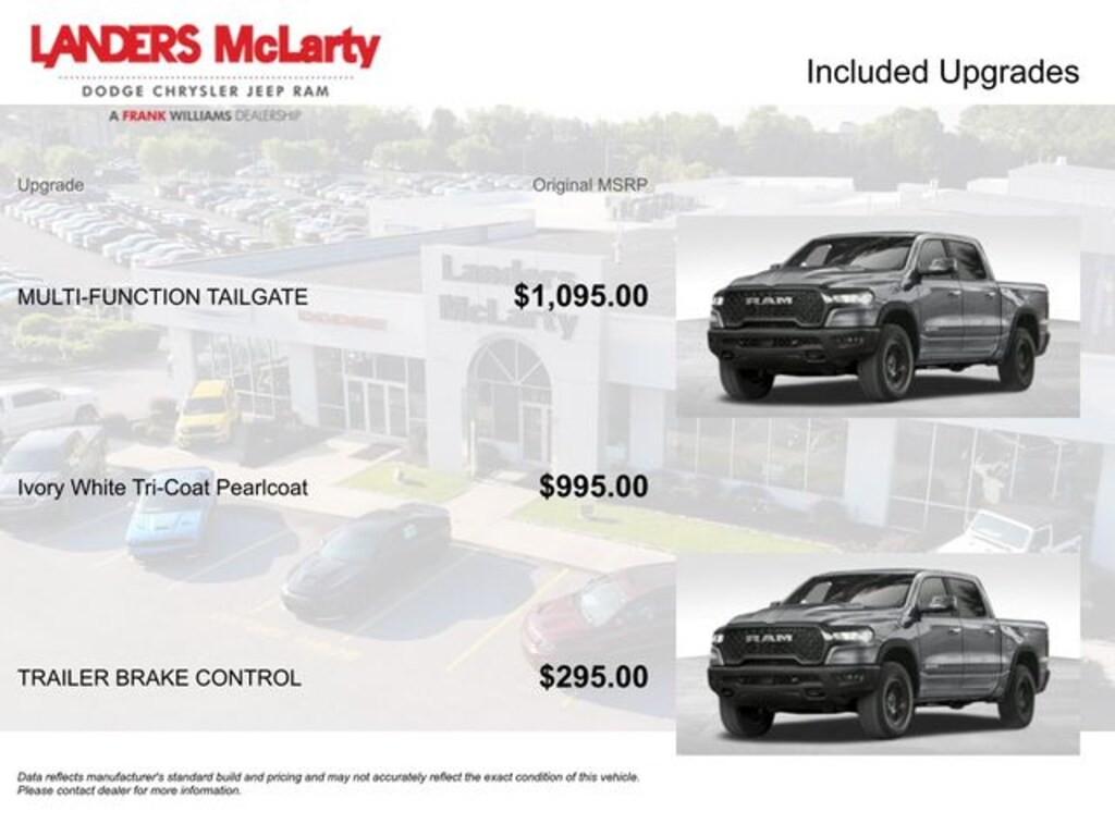 1500 Tungsten, 4D Crew Cab, 3.0L I6, 8-Speed Automatic, 4WD, Ivory White Tri-Coat Pearlcoat, Black Leather, 12-Way/1-Way Trailer Connector, 3.92 Rear Axle Ratio, 4-Wheel Disc Brakes, ABS brakes, Adjustable pedals, Air Conditioning, Alloy wheels, AM/FM radio, Apple CarPlay/Android Auto, Audio memory, Auto High-beam Headlights, Auto Power-Folding Mirrors, Auto-dimming door mirrors, Auto-Dimming Exterior Driver Mirror, Auto-dimming Rear-View mirror, Auto-leveling suspension, Automatic temperature control, Bodyside moldings, Brake assist, Bumpers: body-color, Chrome Exterior Mirrors, Compass, Delay-off headlights, Driver door bin, Driver vanity mirror, Dual front impact airbags, Dual front side impact airbags, Electronic Stability Control, Exterior Mirrors Courtesy Lamps, Exterior Mirrors w/Heating Element, Exterior Mirrors w/Memory, Exterior Mirrors w/Supplemental Signals, Exterior Parking Camera Rear, Front anti-roll bar, Front Bucket Seats, Front Center Armrest w/Storage, Front dual zone A/C, Front fog lights, Front reading lights, Front wheel independent suspension, Fully automatic headlights, Garage door transmitter, Heads-Up Display, Heated door mirrors, Heated front seats, Heated rear seats, Heated steering wheel, Illuminated entry, Leather steering wheel, Low tire pressure warning, Manufacturer's Statement of Origin, Memory seat, Multi-Function Tailgate, Navigation System, Occupant sensing airbag, Outside temperature display, Overhead airbag, Overhead console, Panic alarm, Passenger door bin, Passenger vanity mirror, Pedal memory, Power adjustable front head restraints, Power door mirrors, Power driver seat, Power moonroof, Power passenger seat, Power steering, Power windows, Premium Leather Bucket Seats, Quick Order Package 22V Tungsten, Radio data system, Radio: Uconnect 5 Nav w/14.4" Display, Rain sensing wipers, RAM's Head Badge, Rear anti-roll bar, Rear reading lights, Rear seat center armrest, Rear step bumper, Rear window defroster, Remote keyless entry, Remote Tailgate Release, Security system, Speed control, Split folding rear seat, Steering wheel mounted audio controls, Tachometer, Telescoping steering wheel, Tilt steering wheel, Traction control, Trailer Brake Control, Trip computer, Turn signal indicator mirrors, Variably intermittent wipers, Ventilated front seats, Ventilated rear seats, Voltmeter, Wheels: 22" x 9" Polish/Painted w/Inserts. 3.0L I6 Ivory White Tri-Coat Pearlcoat 2026 Ram 1500 Tungsten 4WD 8-Speed Automatic