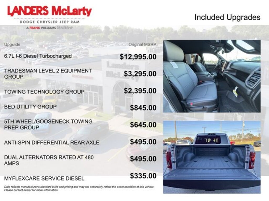 **10YR 100K WARRANTY**, 2500 Tradesman, 4D Crew Cab, 6.7L I6, 8-Speed Automatic, 4WD, Silver Zynith, Diesel Gray/Black Vinyl, 115V Auxiliary Front Power Outlet, 12" Touchscreen Display, 2 Way Rear Headrest Seat, 4 Way Front Headrests, 4-Wheel Disc Brakes, 40/20/40 Split Bench Seat, 400W Inverter, 4G LTE Wi-Fi Hot Spot, 5th Wheel/Gooseneck Towing Prep Group, 6 Speakers, ABS brakes, Add Back Vinyl Seat, Air Conditioning, Air Conditioning ATC w/Dual Zone Control, Alexa Built-In, AM/FM radio: SiriusXM, Anti-Spin Differential Rear Axle, Apple CarPlay, Apple CarPlay/Android Auto, Auto Power-Folding Mirrors, Auto-Dimming Rear-View Mirror, Bed Utility Group, Black Exterior Mirrors, Black Wheel Center Hub, Blind Spot & Cross Path Detection, Brake assist, Bright Front Bumper, Bright Rear Bumper, Carpet Floor Covering, Center Hub, Chrome Grille Surround, Clearance Lamps, Cloth 40/20/40 Bench Seat, Compass, Connected Travel & Traffic Services, Connectivity - US/Canada, CTR Stop Lamp w/Cargo View Camera, Dash Pass Thru Wire Circuits, Delay-off headlights, Disassociated Touchscreen Display, Driver door bin, Dual Alternators Rated at 480 Amps, Dual front impact airbags, Dual front side impact airbags, Electronic Stability Control, Emergency Vehicle Alert System (EVAS), Exterior 115V AC Outlet, Exterior Mirrors Courtesy Lamps, Exterior Mirrors w/Heating Element, Exterior Mirrors w/Supplemental Signals, For Details, Visit DriveUconnect.com, For More Info, Call 800-643-2112, Forward & Reverse Utility Lights, Front & Rear Floor Mats, Front anti-roll bar, Front Armrest w/Cupholders, Front Center Armrest w/Storage, Front fog lights, Front License Plate Bracket, Front reading lights, Fully automatic headlights, Global Telematics Box Module (TBM), Google Android Auto, GPS Antenna Input, GPS Navigation, HD Radio, Heavy Duty Vinyl 40/20/40 Split Bench Seat, I/P Mounted Auxiliary Switches, Illuminated entry, Integrated Voice Command w/Bluetooth, LED Bed Lighting, LED Tail Lamps, Low tire pressure warning, Manual Adjust 4-Way Driver Seat, Manual Adjust 4-Way Front Passenger Seat, Manual Folding Exterior Mirrors, Manual Telescoping Mirrors, Matte Black Mesh Grille w/Chrome, Mirror Running Lights, Mopar Black Tubular Side Steps, MOPAR Deployable Bed Step, MOPAR Front & Rear Rubber Floor Mats, MOPAR Spray In Bedliner, MyFlexCare Service Diesel, Occupant sensing airbag, Off-Road Info Pages, Outside temperature display, Overhead airbag, Overhead console, Panic alarm, ParkSense Front/Rear Park Assist System, ParkView Rear Back-Up Camera, Passenger door bin, Passenger vanity mirror, Power Adjust Mirrors, Power Heated Folding Telescope Mirrors, Power Heated Folding Telescopic Mirrors, Power steering, Power Telescoping Mirrors, Power windows, Power-Adjustable Convex Aux Mirrors, Quick Order Package 24A Tradesman, Radio data system, Radio: Uconnect 5 Nav w/12.0" Display, Radio: Uconnect 5 w/8.4" Display, Rear anti-roll bar, Rear Folding Seat, Rear Power Sliding Window, Rear step bumper, Rear window defroster, Red Tail Lamp Bezels, Remote keyless entry, Remote USB Port - Charge Only, Selectable Tire Fill Alert, SiriusXM Radio Service, SiriusXM w/360L, Speed control, Storage Tray, Surround View Camera System, Tachometer, Tilt steering wheel, Tinted Acoustic Windshield Glass, Towing Technology Group, Traction control, Tradesman Level 2 Equipment Group, Trailer Reverse Guidance, Trailer Tire Pressure Monitoring System, Trailer Tow Pages, Variably intermittent wipers, Voltmeter, Wheels: 17" x 7.5" Bl Price includes: $1000 - 2026 Commercial Bonus Cash. Exp. 01/05/2026 $1000 - 2026 National Bonus Cash . Exp. 01/05/2026 $500 - 2026 National 2026 Military Bonus Cash . Exp. 01/05/2026 $2,000 - Exp. 01/03/2026 MUST TRADE A 2014 MODEL YEAR OR NEWER. PLEASE CONTACT DEALER FOR DETAILS. OFFER IS ONLY VALID ON IN STOCK UNITS $4,000 - Exp. 01/03/2026. MUST TRADE MODEL YEAR 2014 OR NEWER VEHICLE. OFFER IS ONLY VALID ON IN-STOCK UNITS. Price includes $999 dealer added accessories.