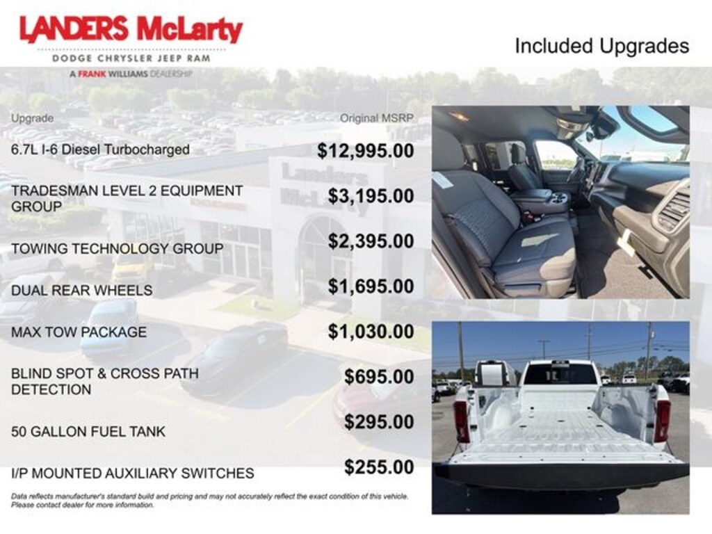 **10YR 100K WARRANTY**, 3500 Tradesman, 4D Crew Cab, 6.7L I6, 8-Speed Automatic, 4WD, Bright White Clearcoat, Black Cloth, 115V Auxiliary Front Power Outlet, 12" Touchscreen Display, 2 Way Rear Headrest Seat, 4 Way Front Headrests, 4-Wheel Disc Brakes, 40/20/40 Split Bench Seat, 400W Inverter, 4G LTE Wi-Fi Hot Spot, 50 Gallon Fuel Tank, 5th Wheel/Gooseneck Towing Prep Group, 6 Speakers, 6000# Front Axle w/Hub Ext, ABS brakes, Air Conditioning, Air Conditioning ATC w/Dual Zone Control, Alexa Built-In, AM/FM radio: SiriusXM, Apple CarPlay, Apple CarPlay/Android Auto, Auto Power-Folding Mirrors, Auto-Dimming Rear-View Mirror, Black Exterior Mirrors, Black Wheel Center Hub, Blind Spot & Cross Path Detection, Box & Rear Fender Clearance Lamps, Brake assist, Bright Front Bumper, Bright Rear Bumper, Carpet Floor Covering, Center Hub, Chrome Grille Surround, Clearance Lamps, Cloth 40/20/40 Bench Seat, Cold Weather Group, Compass, Connected Travel & Traffic Services, Connectivity - US/Canada, Convenience Group, CTR Stop Lamp w/Cargo View Camera, Dash Pass Thru Wire Circuits, Delay-off headlights, Disassociated Touchscreen Display, Driver door bin, Dual front impact airbags, Dual front side impact airbags, Dual Rear Wheels, Electronic Stability Control, Emergency Vehicle Alert System (EVAS), Engine Block Heater, Exterior 115V AC Outlet, Exterior Mirrors Courtesy Lamps, Exterior Mirrors w/Heating Element, Exterior Mirrors w/Supplemental Signals, For Details Visit DriveUconnect.com, For More Info, Call 800-643-2112, Forward & Reverse Utility Lights, Front & Rear Floor Mats, Front anti-roll bar, Front Armrest w/Cupholders, Front Center Armrest w/Storage, Front fog lights, Front reading lights, Fully automatic headlights, Global Telematics Box Module (TBM), Google Android Auto, GPS Antenna Input, GPS Navigation, HD Radio, HD Vinyl 40/20/40 Split Bench Seat, I/P Mounted Auxiliary Switches, Illuminated entry, Integrated Voice Command w/Bluetooth, LED Tail Lamps, Low tire pressure warning, Manual Adjust 4-Way Driver Seat, Manual Adjust 4-Way Front Passenger Seat, Manual Folding Exterior Mirrors, Manual Telescoping Mirrors, Matte Black Mesh w/Chrome Grille, Max Tow Package, Mirror Running Lights, Mopar Black Tubular Side Steps, MOPAR Winter Front Grille Cover, Nexen Brand Tires, Occupant sensing airbag, Off-Road Information Pages, Outside temperature display, Overhead airbag, Overhead console, Panic alarm, ParkSense Front/Rear Park Assist System, ParkView Rear Back-Up Camera, Passenger door bin, Passenger vanity mirror, Power Adjust Mirrors, Power Heat Fold Telescopic Mirrors, Power Heated Fold Telescopic Mirrors, Power steering, Power Telescoping Mirrors, Power windows, Power-Adjustable Convex Aux Mirrors, Quick Order Package 24A Tradesman, Radio data system, Radio: Uconnect 5 Nav w/12.0" Display, Radio: Uconnect 5 w/8.4" Display, Rear Folding Seat, Rear Power Sliding Window, Rear step bumper, Rear Wheelhouse Liners, Rear window defroster, Red Tail Lamp Bezels, Remote keyless entry, Remote USB Port - Charge Only, Selectable Tire Fill Alert, SiriusXM Radio Service, SiriusXM w/360L, Speed control, Storage Tray, Surround View Camera System, Tachometer, Tilt steering wheel, Tinted Acoustic Windshield Glass, Towing Technology Group, Traction control, Tradesman Level 2 Equipment Group (DISC), Trailer Reverse Guidance, Trailer Tire Pressure Monitoring System, Trailer Tow Pages, Variably intermittent wipers, Voltmeter, Wheels: 17" x 6.0" Polished Aluminum (DISC), Wheels: 18" x 8.0" Black Pain Price includes: $1000 - 2026 National Bonus Cash . Exp. 12/01/2025 $2000 - 2026 National Holiday Select Inventory Bonus Cash. Exp. 12/01/2025 $500 - 2026 National 2026 Military Bonus Cash . Exp. 01/05/2026 $2,000 - Exp. 12/02/2025 MUST TRADE A 2012 MODEL YEAR OR NEWER. PLEASE CONTACT DEALER FOR DETAILS. OFFER IS ONLY VALID ON IN STOCK UNITS $1,000 - Exp. 12/02/2025 MUST FINANCE WITH A PREFERRED LENDER AT A STANDARD APR. NOT COMPATIBLE WITH INCENTIVE APR OFFERS.