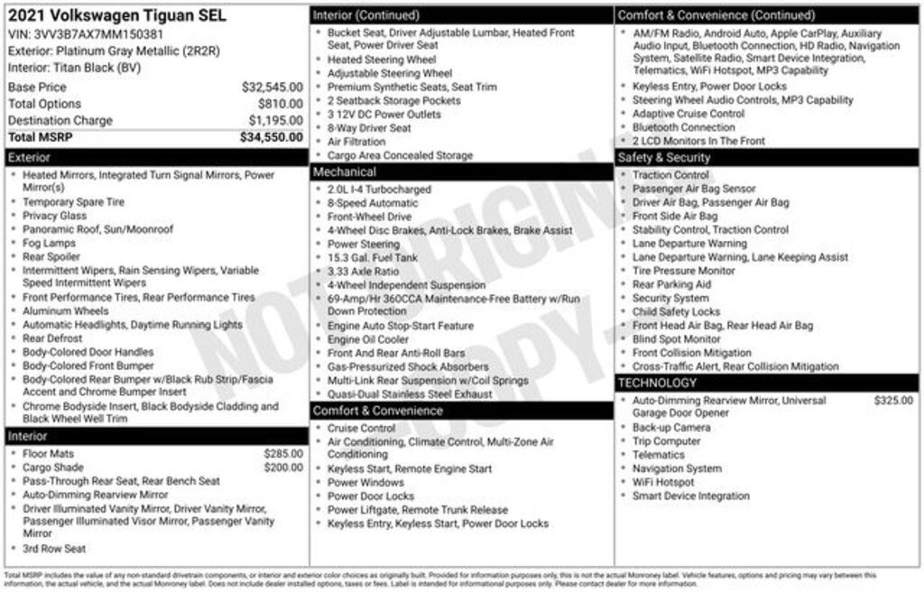 Tiguan 2.0T SEL, 4D Sport Utility, 8-Speed Automatic with Tiptronic, FWD, Platinum Gray Metallic, Titan Black Premium Synthetic, 3-Row Rubber Monster Mats w/Logo Kit (Set of 5), 3.33 Axle Ratio, 3rd row seats: bench, 4-Wheel Disc Brakes, 4-Wheel Independent Suspension, 6 Speakers, ABS brakes, Air Conditioning, Alloy wheels, AM/FM radio: SiriusXM with 360L, Auto-dimming Rear-View mirror, Automatic temperature control, Brake assist, Bumpers: body-color, Cargo Area Retractable Privacy Cover, Compass, Delay-off headlights, Driver door bin, Driver vanity mirror, Dual front impact airbags, Dual front side impact airbags, Electronic Stability Control, Emergency communication system: VW Car-Net services (capabilities require enrollment or subscription), Exterior Parking Camera Rear, Forward collision: FCW w/Autonomous Emergency Braking mitigation, Four wheel independent suspension, Frameless Auto-Dimming Rearview Mirror, Front anti-roll bar, Front Bucket Seats, Front Center Armrest, Front dual zone A/C, Front fog lights, Front reading lights, Fully automatic headlights, Heated door mirrors, Heated Front Comfort Seats, Heated front seats, Heated steering wheel, Heavy Duty Trunk Liner w/VW CarGo Blocks, Illuminated entry, Leather Shift Knob, Low tire pressure warning, Navigation system: VW Car-Net Guide & Inform, Occupant sensing airbag, Outside temperature display, Overhead airbag, Overhead console, Panic alarm, Passenger door bin, Passenger vanity mirror, Perforated V-Tex Leatherette Seating Surfaces, Power door mirrors, Power driver seat, Power Liftgate, Power moonroof, Power steering, Power windows, Radio data system, Radio: MIB3 Discover Media AM/FM/HD, Rain sensing wipers, Rear anti-roll bar, Rear reading lights, Rear seat center armrest, Rear window defroster, Rear window wiper, Remote keyless entry, Roof rack: rails only, Security system, Speed control, Speed-sensing steering, Split folding rear seat, Spoiler, Steering wheel mounted audio controls, Tachometer, Telescoping steering wheel, Tilt steering wheel, Traction control, Trip computer, Turn signal indicator mirrors, Variably intermittent wipers, Wheels: 19" 5-Spoke Gray Alloy. CARFAX One-Owner. Clean CARFAX. Platinum Gray Metallic 2021 Volkswagen Tiguan 2.0T SEL FWD 8-Speed Automatic with Tiptronic 2.0L TSI DOHC